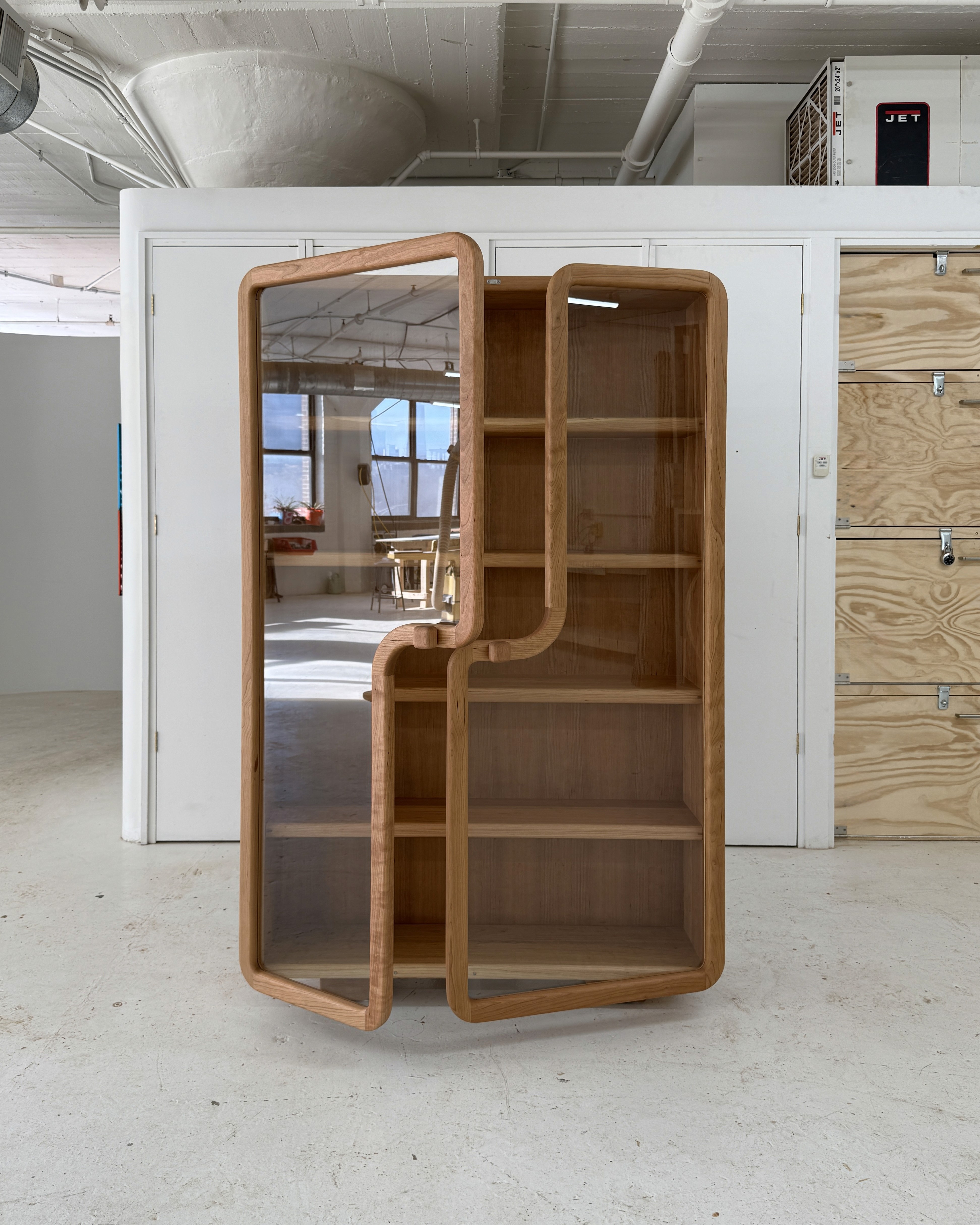 The Toba Cabinet is a display cabinet handmade from cherry wood, featuring glass doors and inset chrome-plated hinges. Soft edges and playful curves create a sense of balance and beauty that set the piece apart in any environment. Built entirely from solid hardwood for heirloom quality, the cabinet can be wall-mounted with a concealed wooden cleat or used freestanding. Toba Cabinet is the perfect showcase for art objects, prized possessions, or as a focal point in any room.
