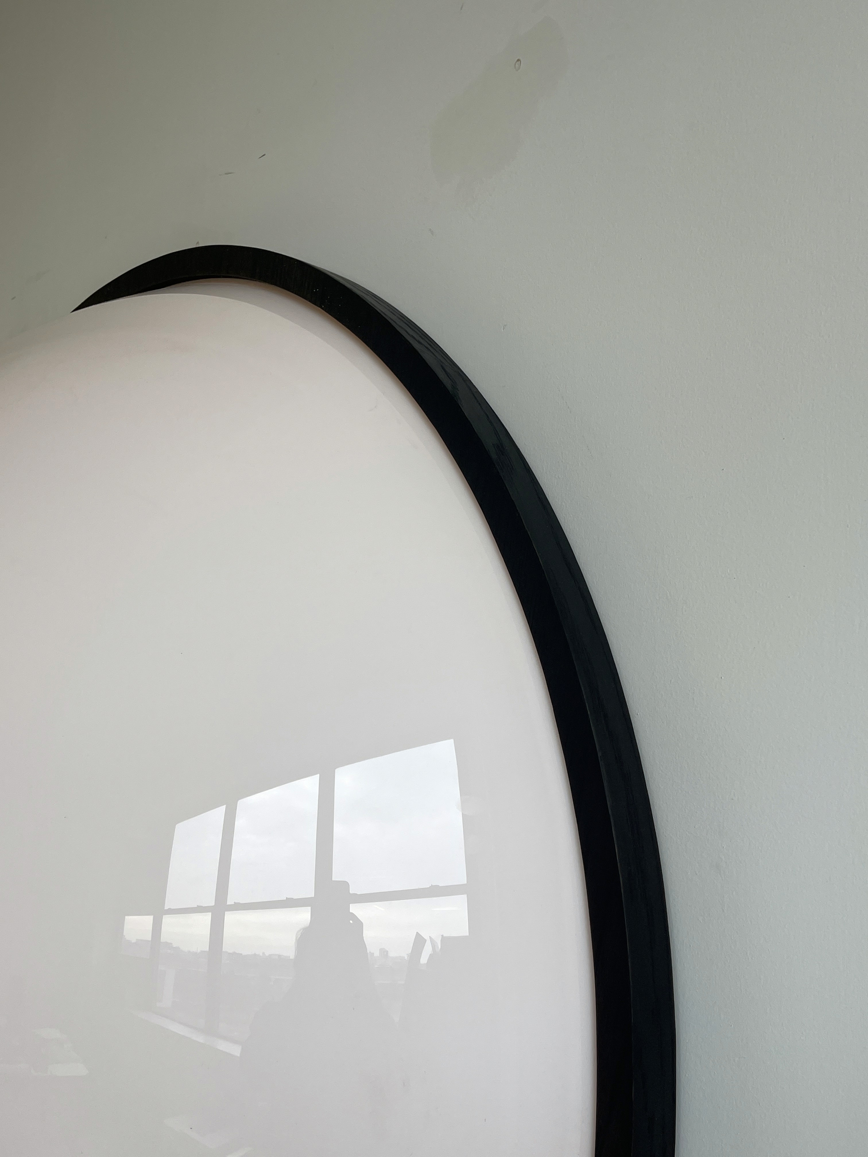 The Moon Lamp inspired by the works of Aquarius Mirrorworks from the 1980s, our Moon Lamp reintroduces the iconic design with a wooden frame, upgraded construction, and bespoke quality. Offered in thick or thin frame style, 36-inch or 48-inch dome size, and natural or black oak wood finish. It is crafted from MDF veneered in white oak, paired with a white translucent plastic dome. The lamp is fitted with an LED bulb and is dimmable via a cord-mounted dimmer controller. It mounts to the wall with a wooden cleat, with detailed instructions included in the package.